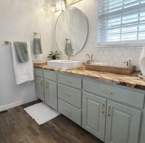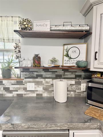 Updated kitchen with new concrete countertops, new sink, and painted cabinets