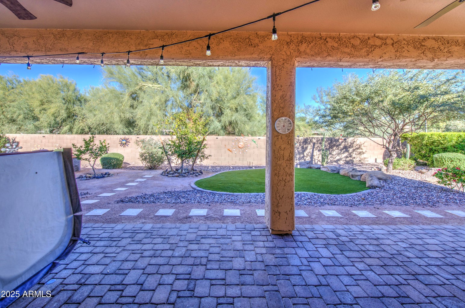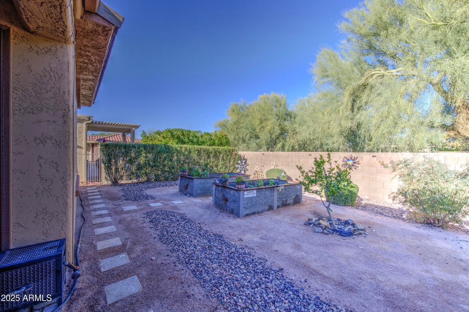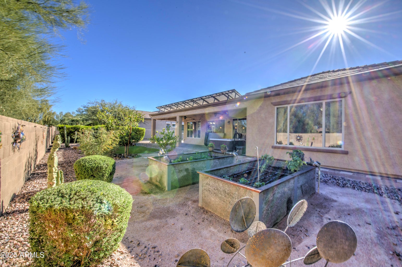 This beautifully appointed 3-bedroom, 2.5-bath home sits on a quiet cul-de-sac near the Union Center and offers exceptional indoor-outdoor living. Inside, enjoy 10-foot ceilings, solid-surface flooring, ceiling fans in every room, and a chef’s kitchen with Wolf cooktop, double ovens, granite counters, and maple cabinets with soft-close doors and roll-outs. Owned solar, a paid Florence bond, and a 700 sq. ft. three-car garage with epoxy flooring and storage cabinets add convenience and value. Outside, a private desert oasis awaits with gated front and backyard patios, artificial turf, citrus trees, raised planter beds, patio lighting, UV solar shades, a Hot Spring spa, and a fully fenced, block-wall backyard perfect for entertaining, gardening, or relaxing in style.