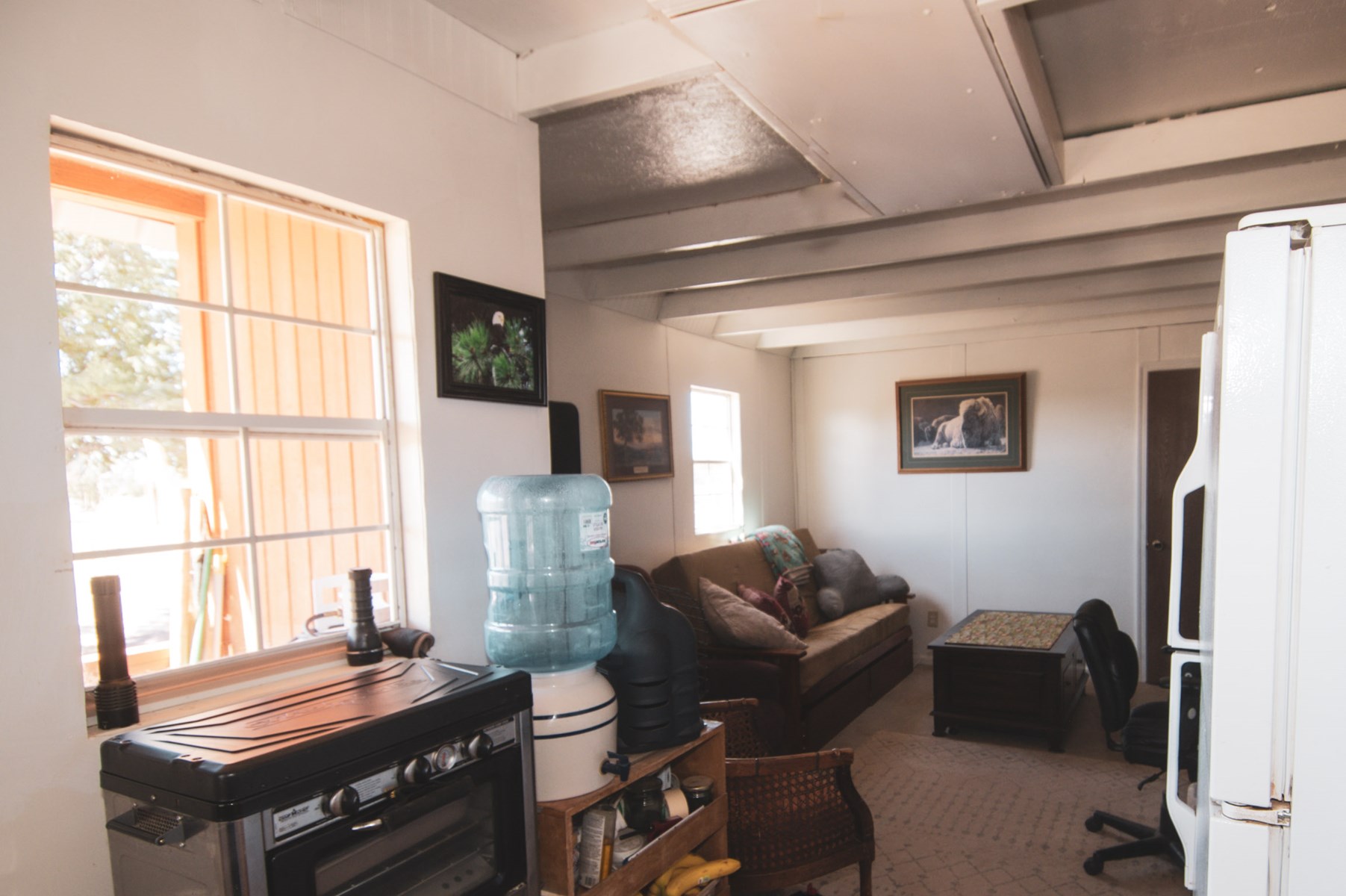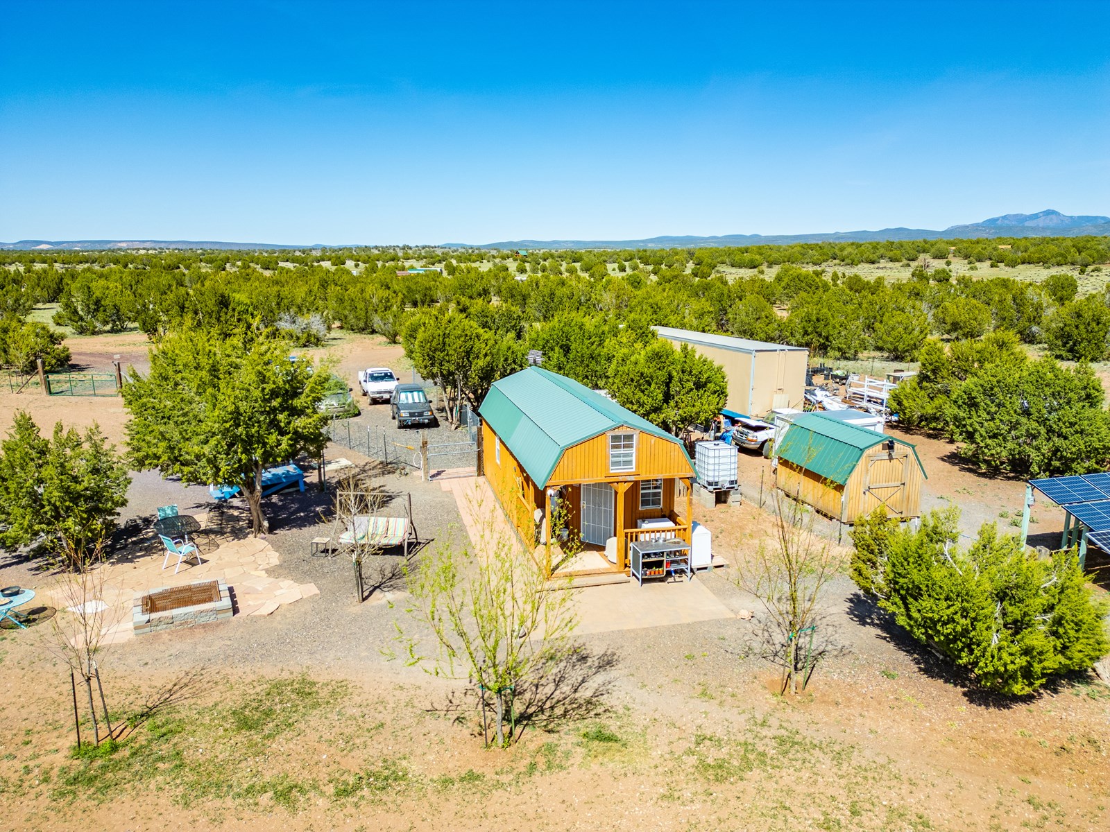 Ten acre homestead for sale in Ash Fork, AZ. No HOA. Good access, not far from Bullock Rd. Property has everything you need for full or part-time living including the comfortable and cozy cabin style home, an 8 x 12 insulated shed perfect for food storage, add'l storage with the 53 ft trailer and approx 2 1/2 acres fenced and gated in several locations with no-climb fencing. Additionally, the grounds include several fruit trees, 3 hose bibs, shaded patio areas, 2,500 gallon water storage, plus other useful structures. Solar system is a top of the line Outback system with 10 solar panels, 24 volt. Back up generator also included with the sale as well as a wood stove, refrigerator, microwave and propane camp oven. Water pickup or delivery avail at corner of Bullock / Cattle