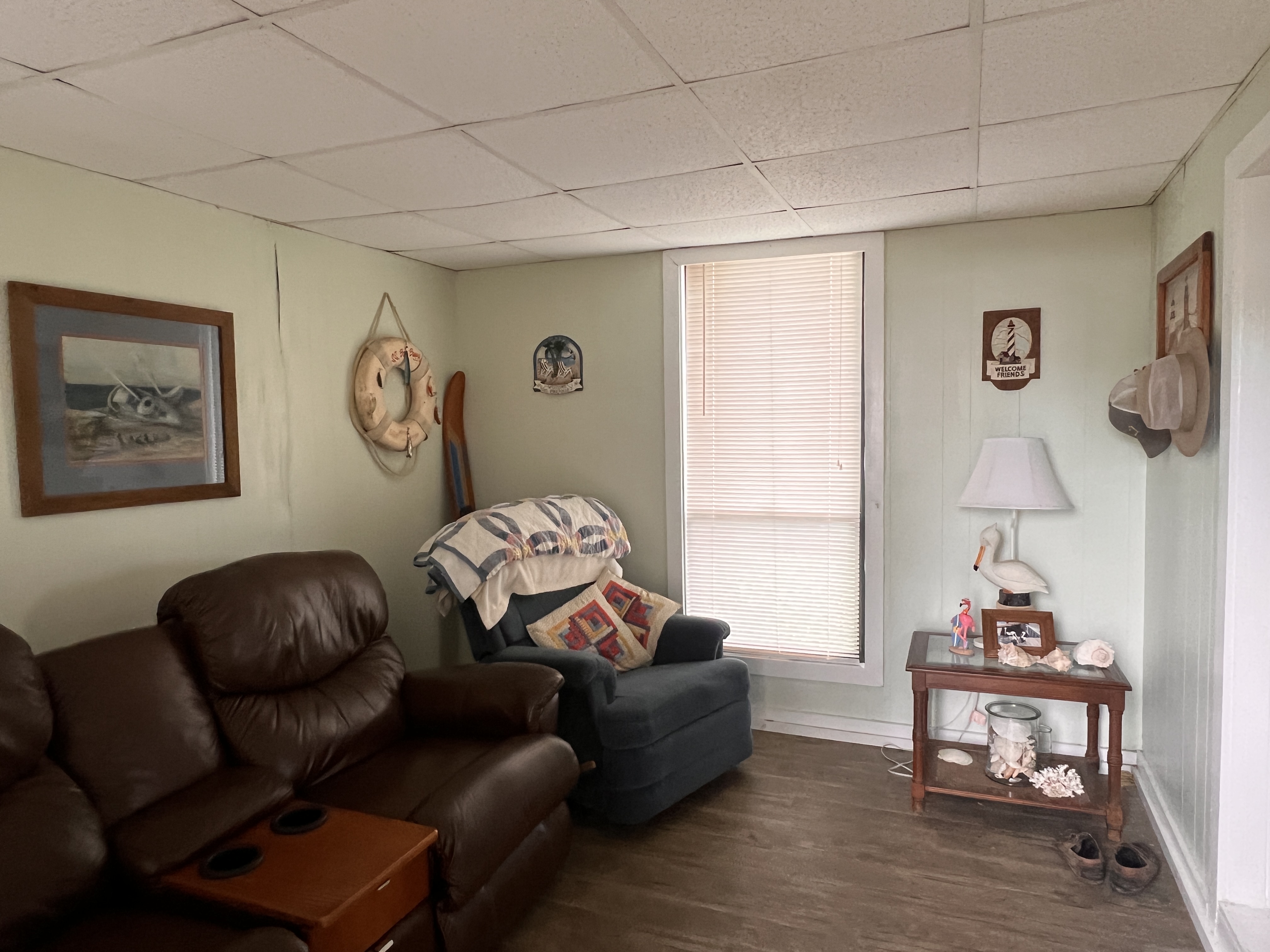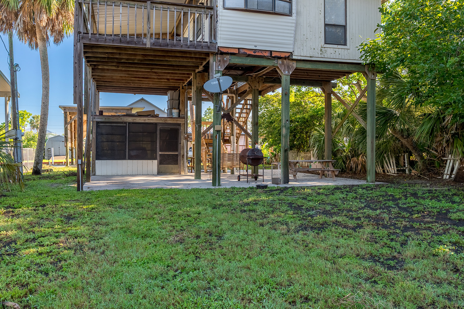 Relish peaceful mornings and relaxing evenings in the spacious screened-in room beneath the house, creating an ideal space for entertaining or unwinding while enjoying the coastal breeze.