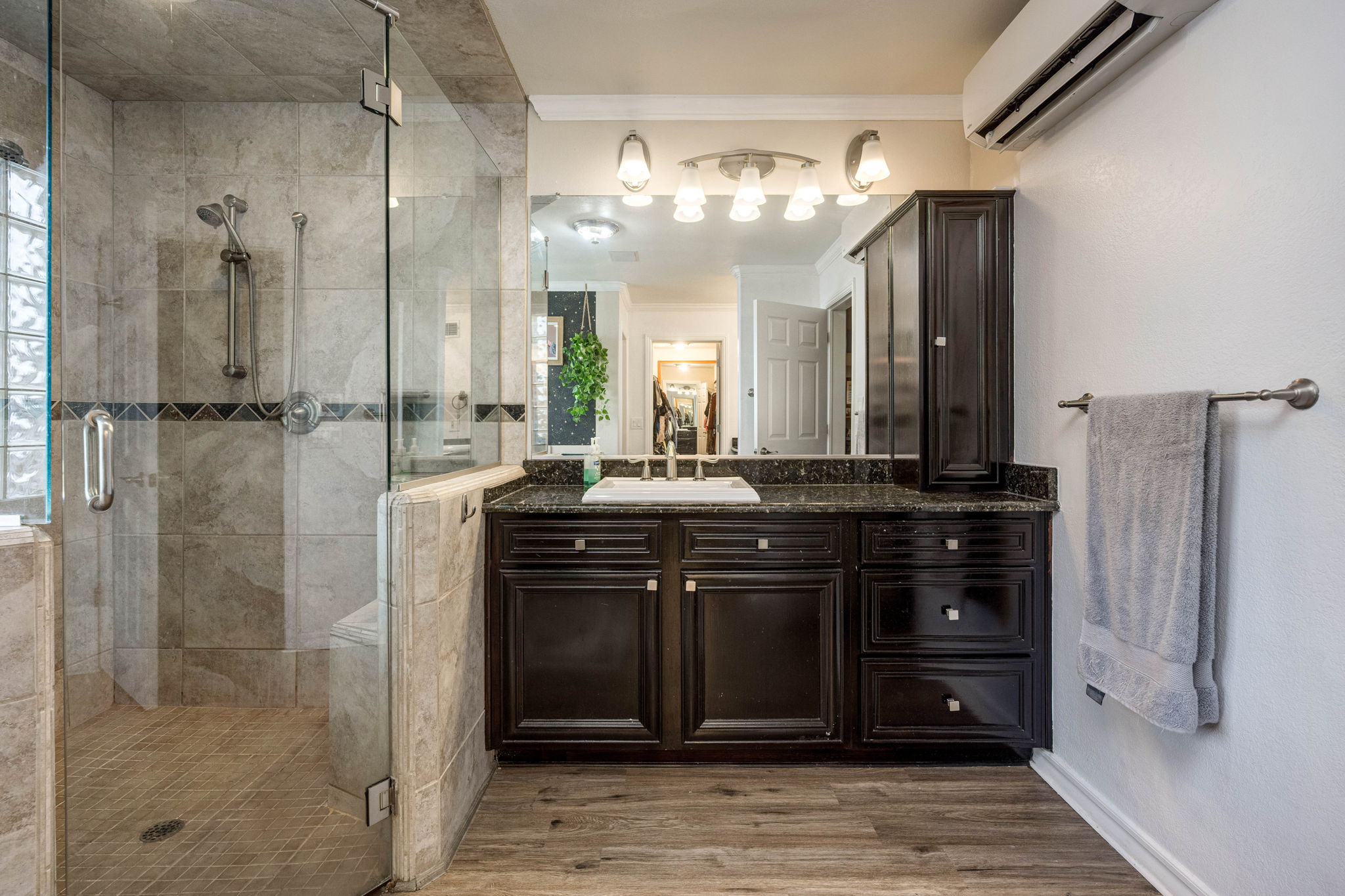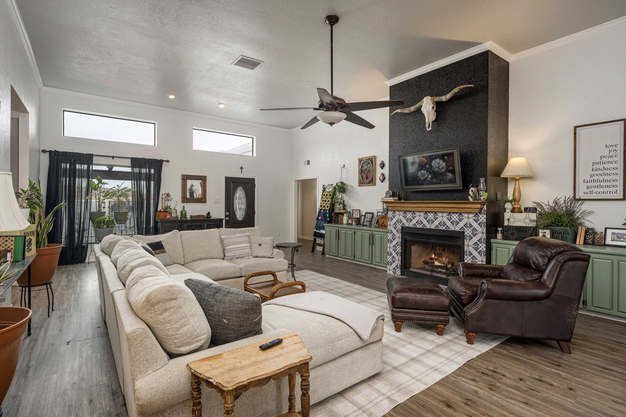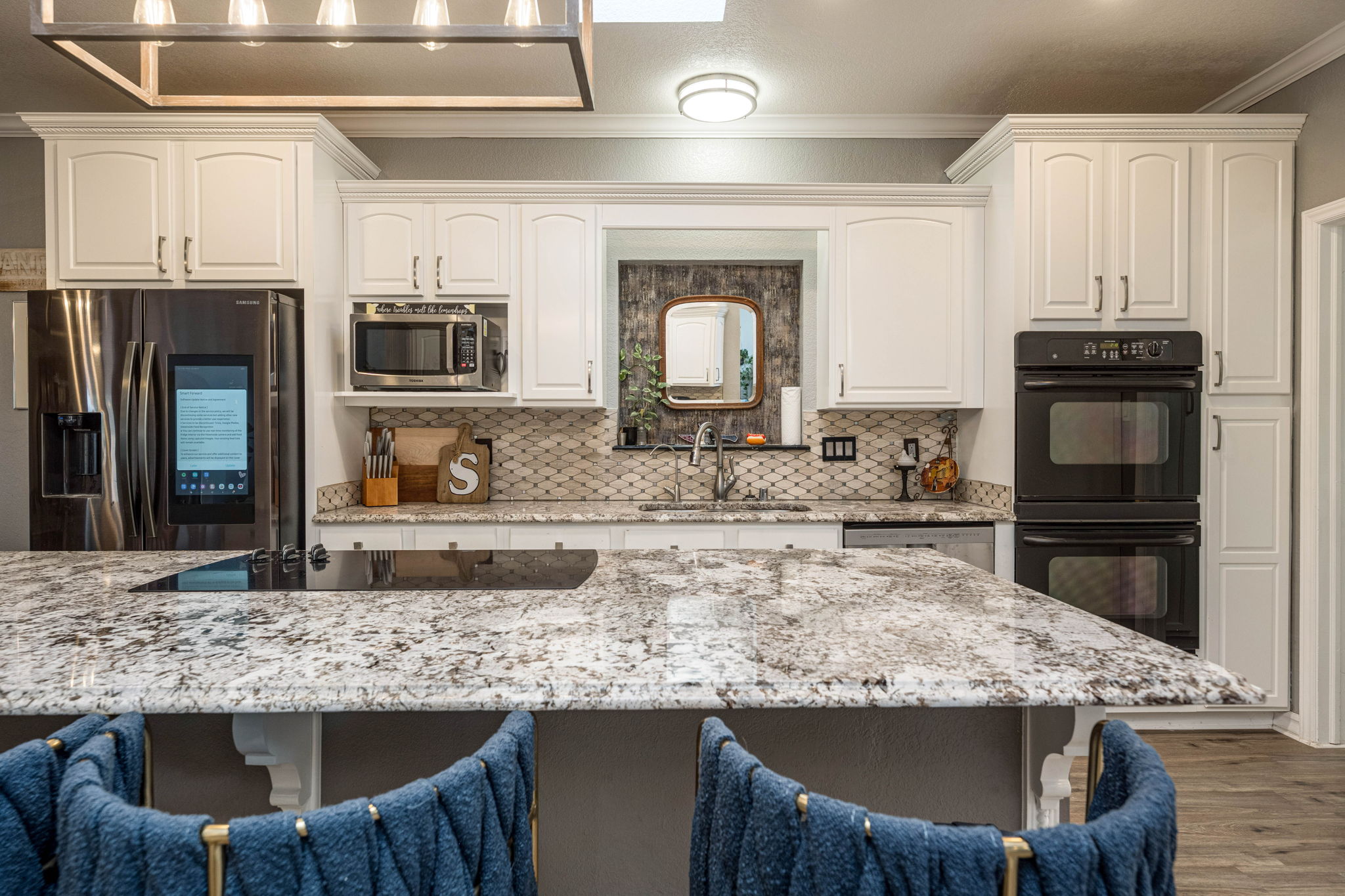 The kitchen is a standout feature, boasting granite countertops, stylish hardware and lighting, a wine rack, abundant cabinetry, an extra-large pantry, double ovens, and a large island with seating. The primary suite serves as a comfortable retreat, complete with a cozy seating area, a mini-split system for additional cooling, and a convenient side entrance door. An office or flex room with French doors opens directly to the covered patio, offering a versatile space for work, hobbies, or guests.
