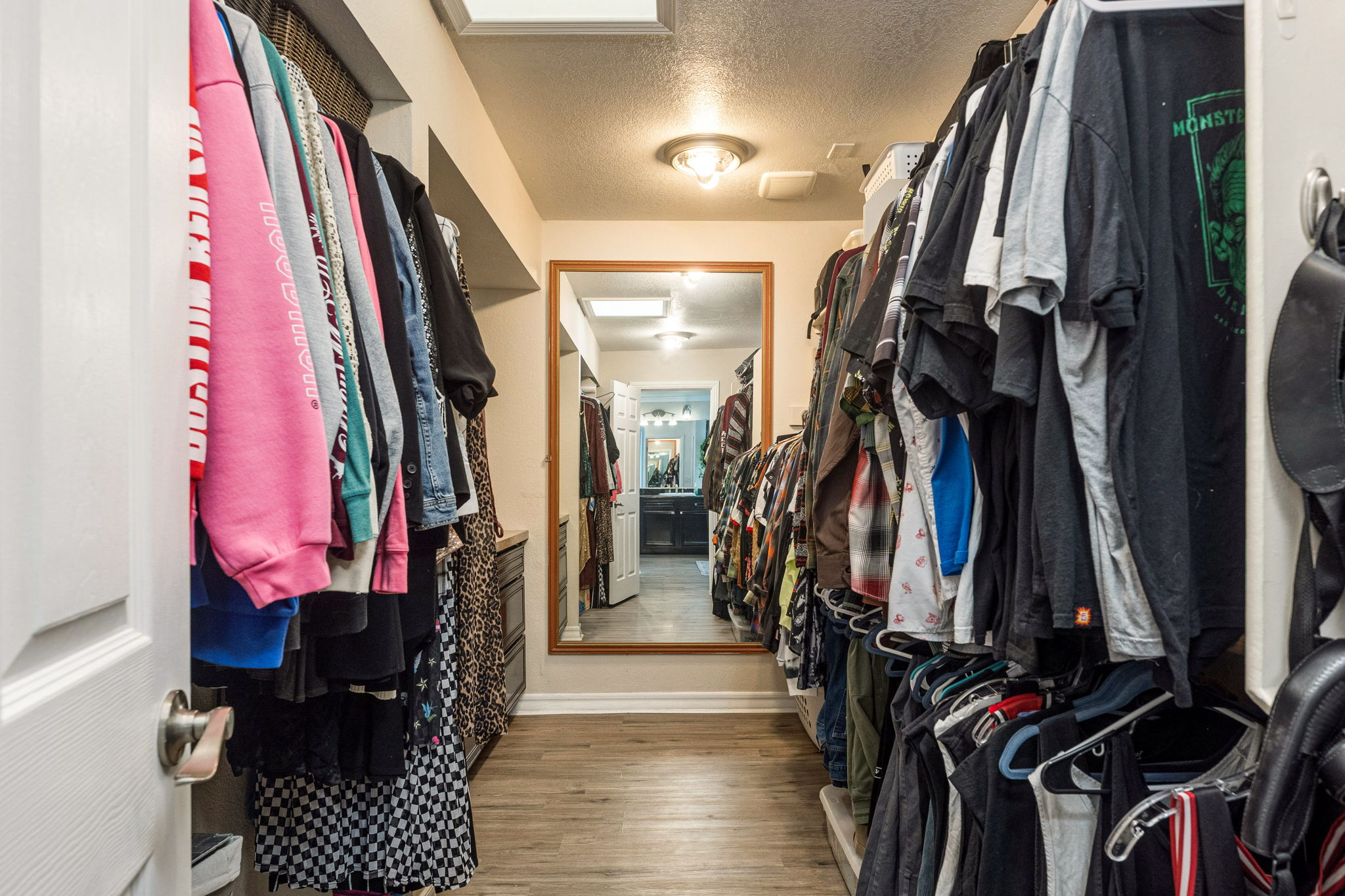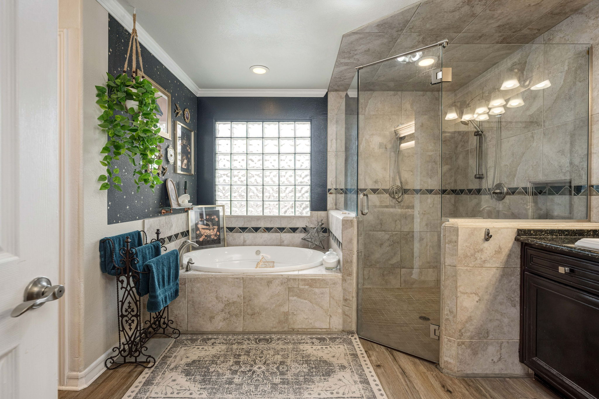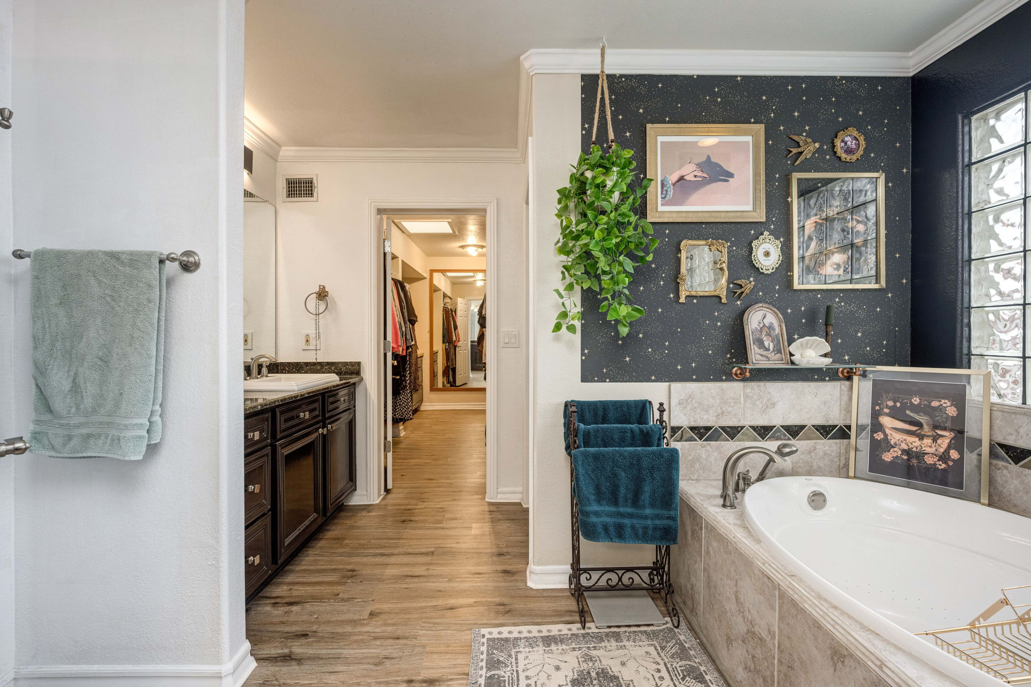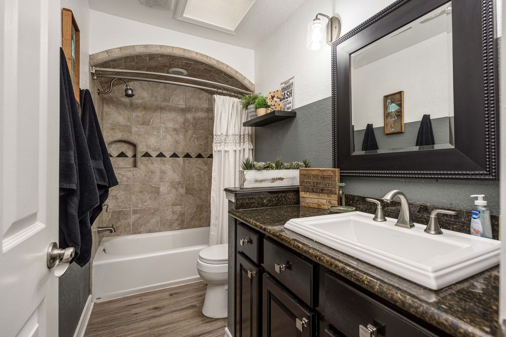 The kitchen is a standout feature, boasting granite countertops, stylish hardware and lighting, a wine rack, abundant cabinetry, an extra-large pantry, double ovens, and a large island with seating. The primary suite serves as a comfortable retreat, complete with a cozy seating area, a mini-split system for additional cooling, and a convenient side entrance door. An office or flex room with French doors opens directly to the covered patio, offering a versatile space for work, hobbies, or guests.
