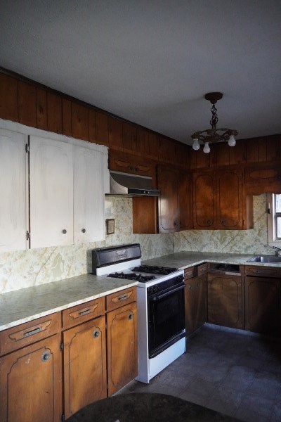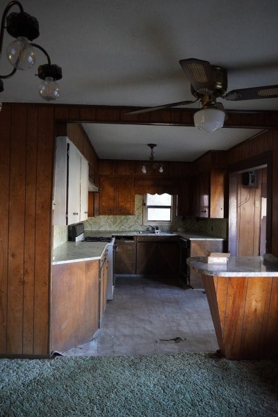 KITCHEN: 8.9 x 12.11, Inlay flooring kitchen cabinets with formica tops and backsplashes, paneled walls, white textured ceilings, and a 3 foot bar separates kitchen from dining area. Appliances include a gas cook stove, vent hood, double stainless sink and dishwasher.