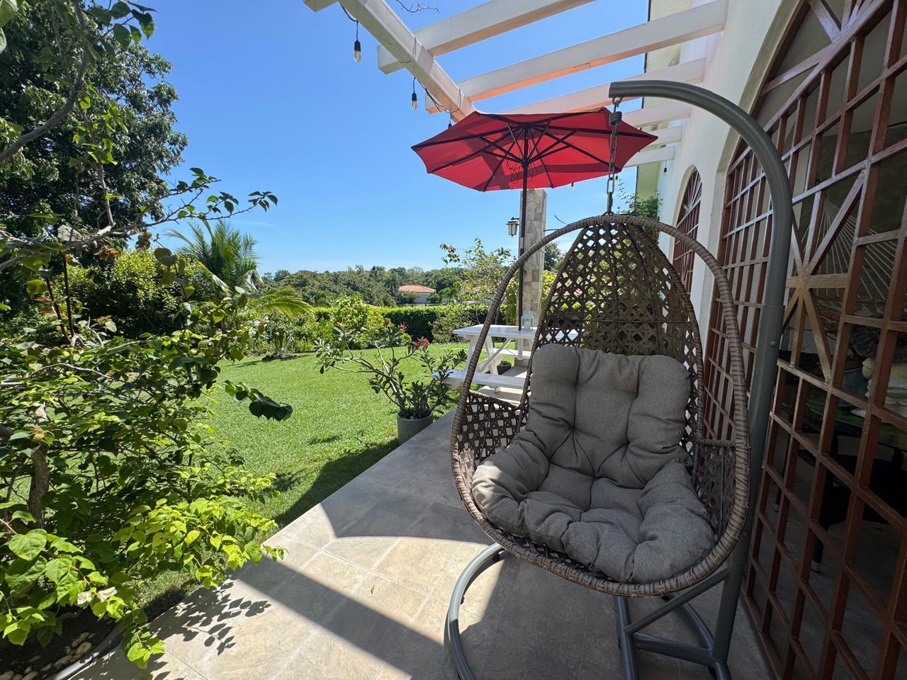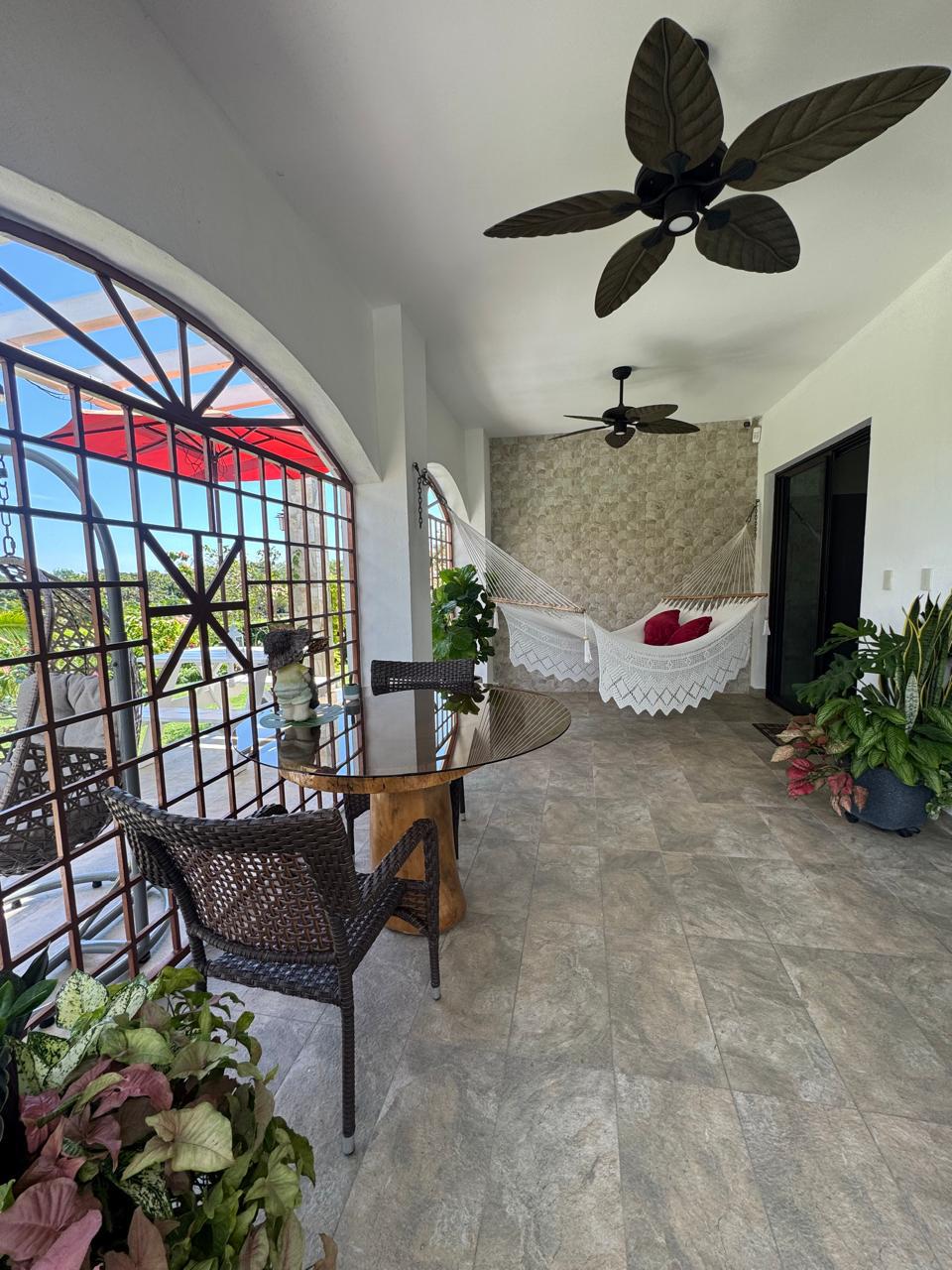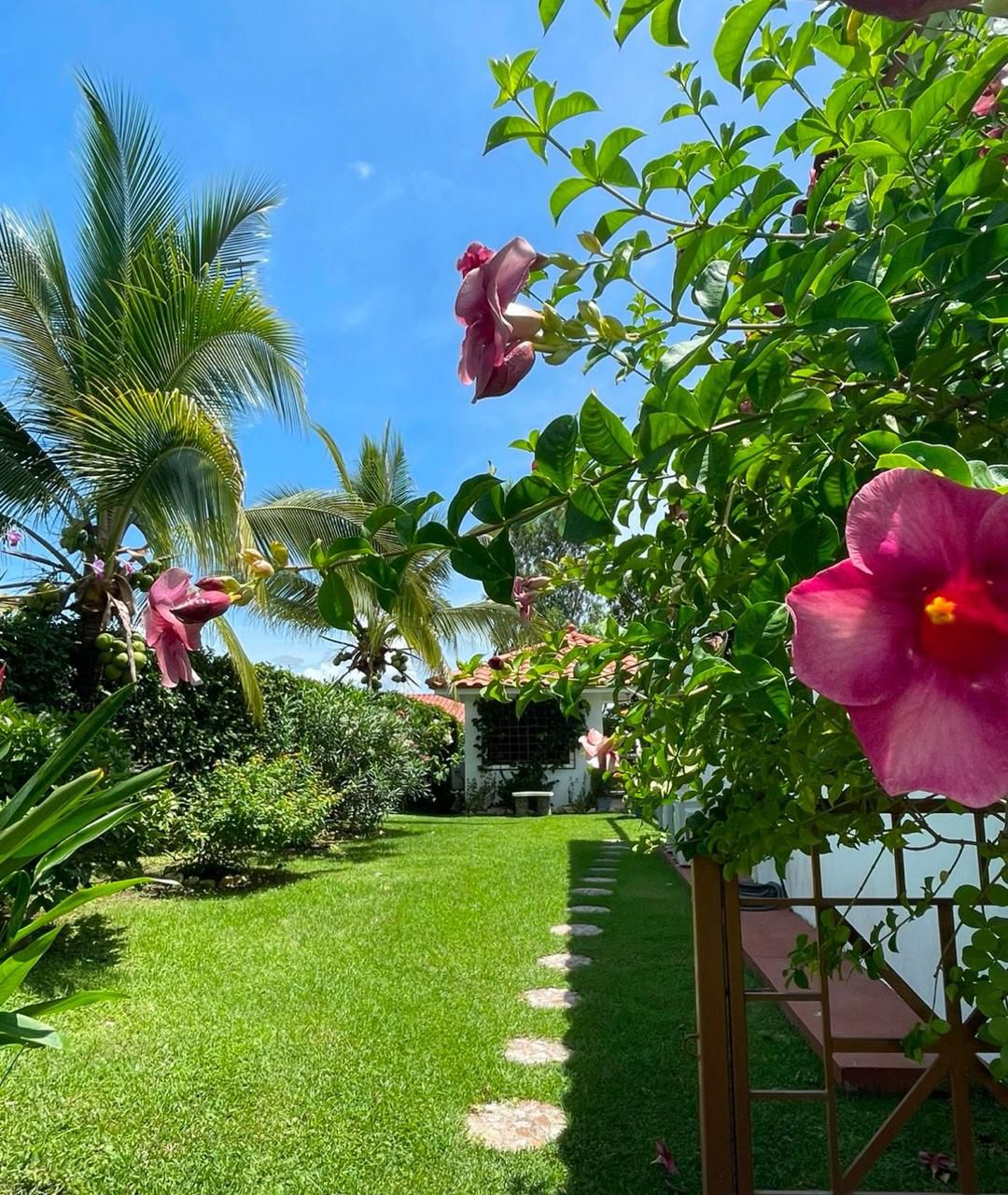 La amplia terraza posterior —con área abierta y techada— conecta con un espectacular jardín lleno de árboles frutales (mango, cacao, nance, guanábana, canela), plantas florales y fauna natural como colibríes y mariposas. La vida al aire libre se enriquece con un área de BBQ y horno para pizzas.