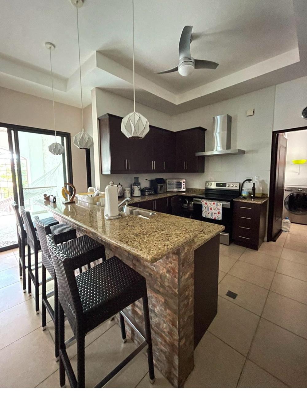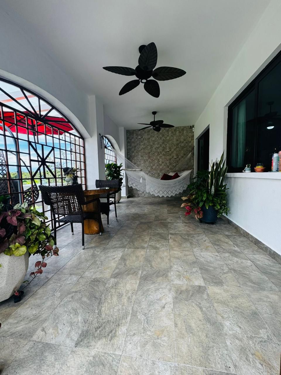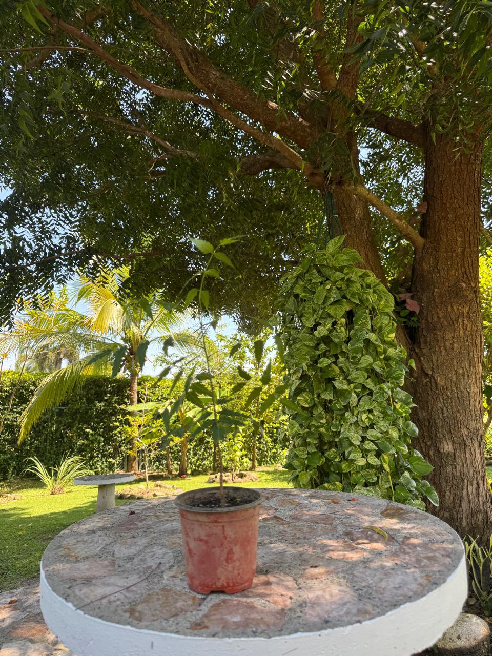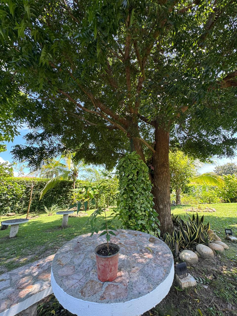 La amplia terraza posterior —con área abierta y techada— conecta con un espectacular jardín lleno de árboles frutales (mango, cacao, nance, guanábana, canela), plantas florales y fauna natural como colibríes y mariposas. La vida al aire libre se enriquece con un área de BBQ y horno para pizzas.
