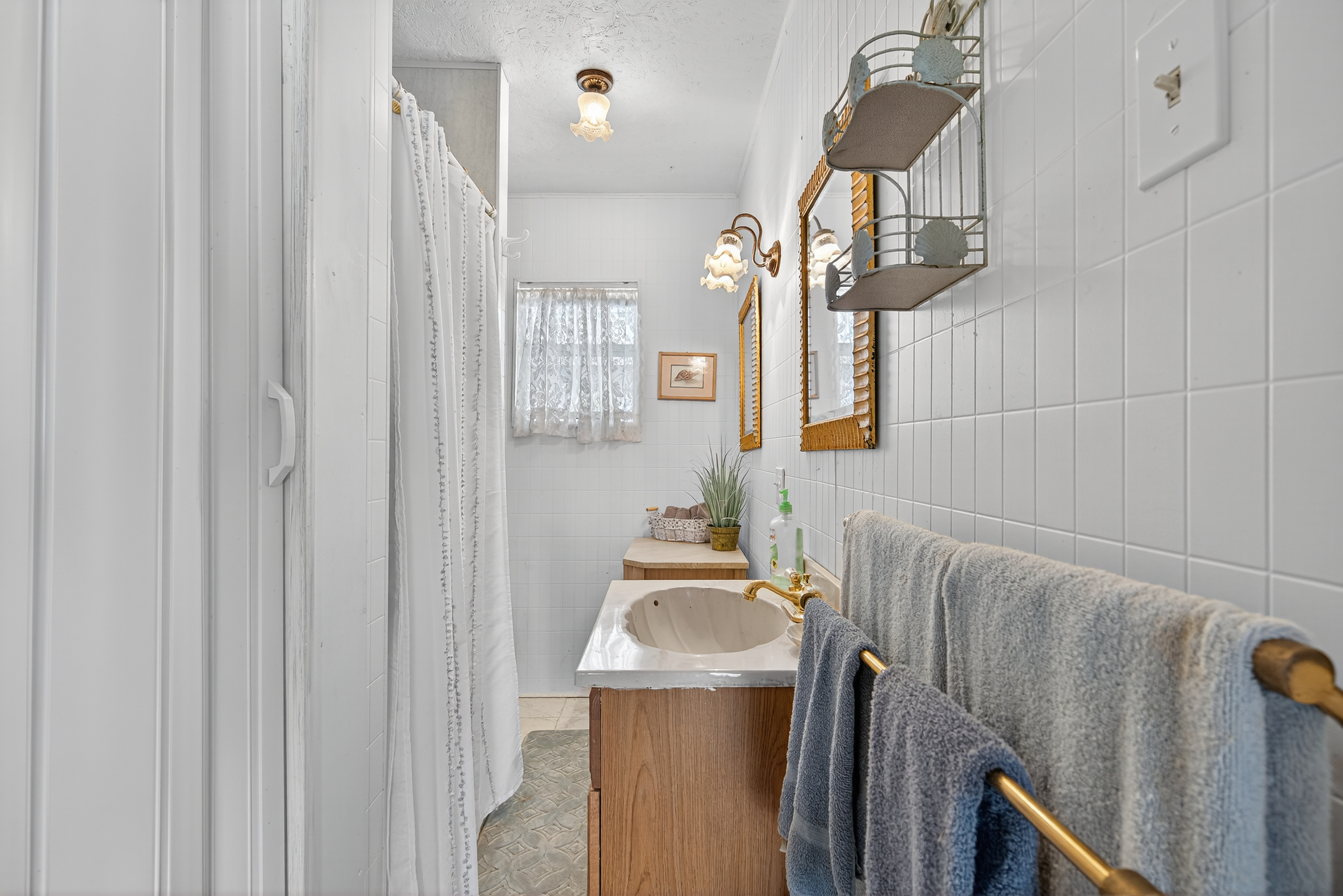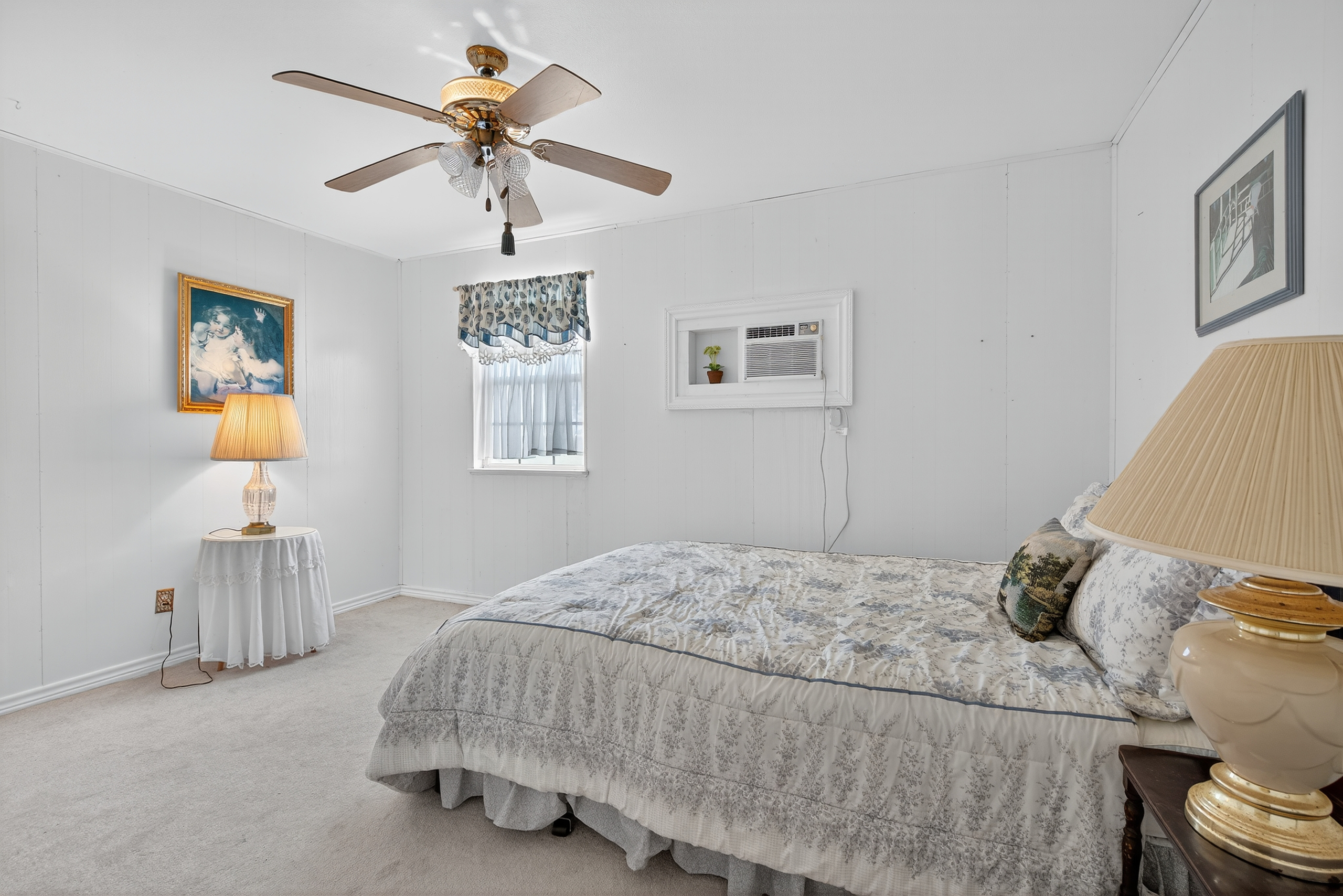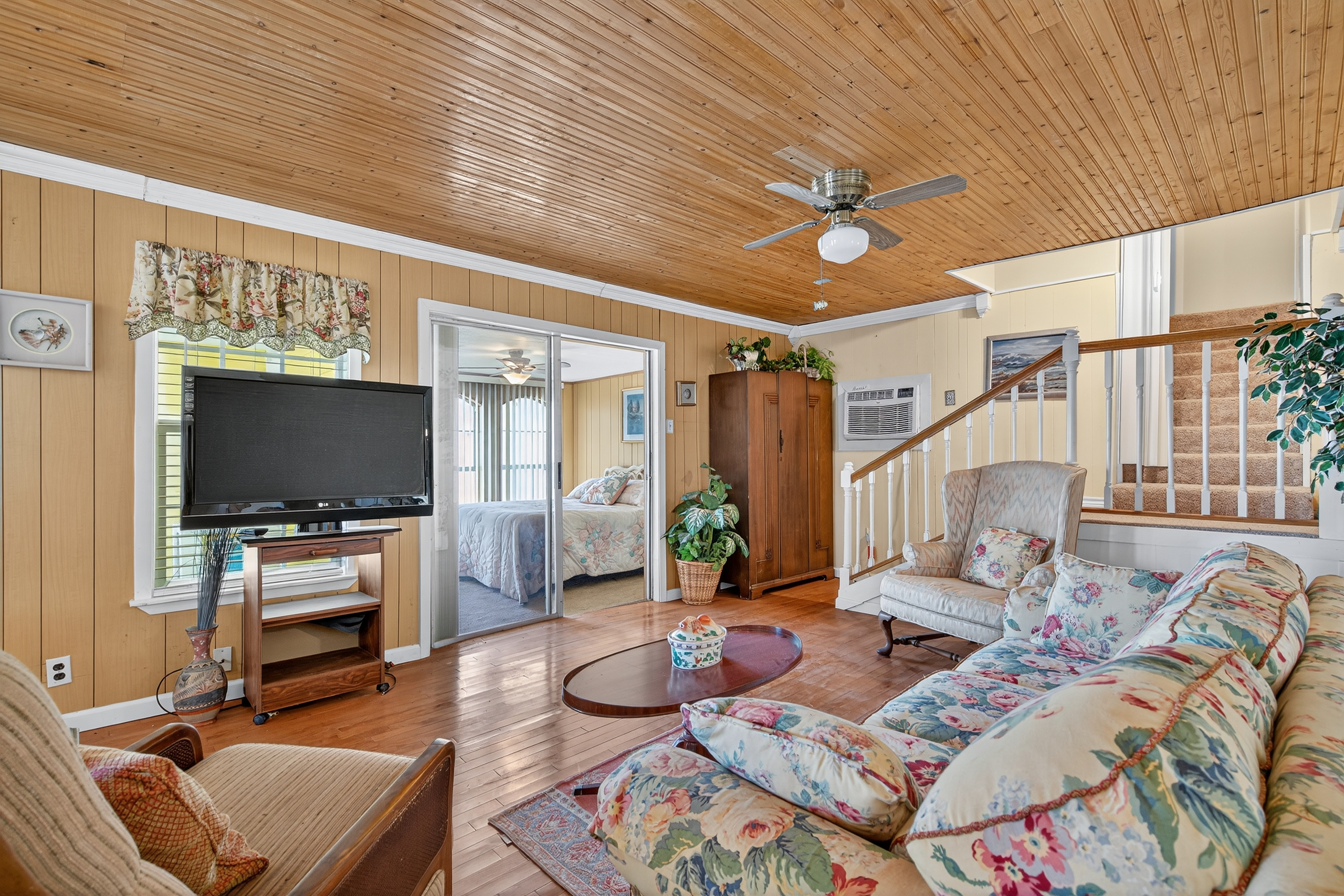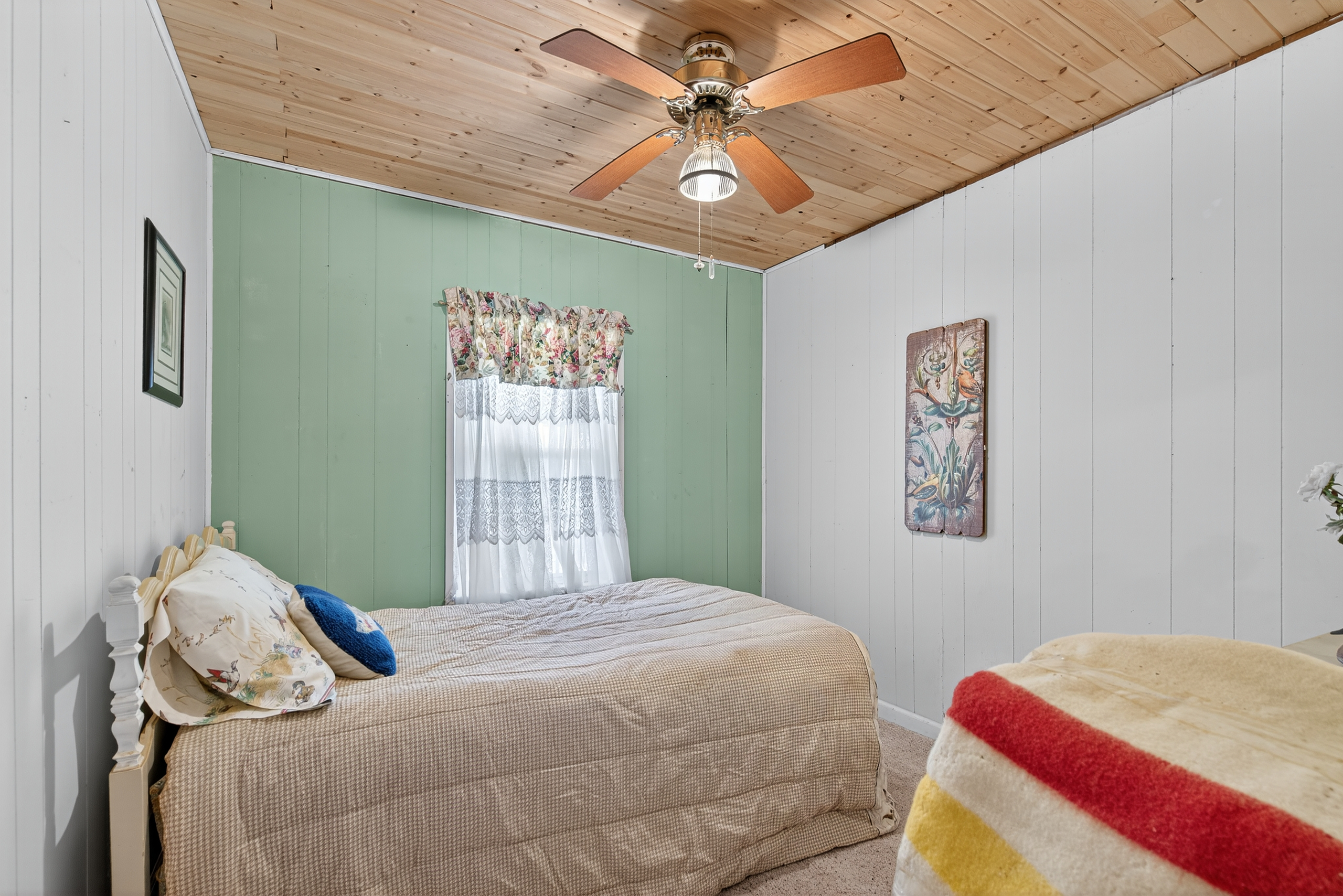 The main living area is bright and airy, with bead board ceilings and open floor plan that makes it easy to flow from room to room. The kitchen offers ample cabinet space, perfect for preparing meals for family and friends. Step outside to the covered front and back porches, ideal for enjoying the outdoors and watching the sunset over the lake.
