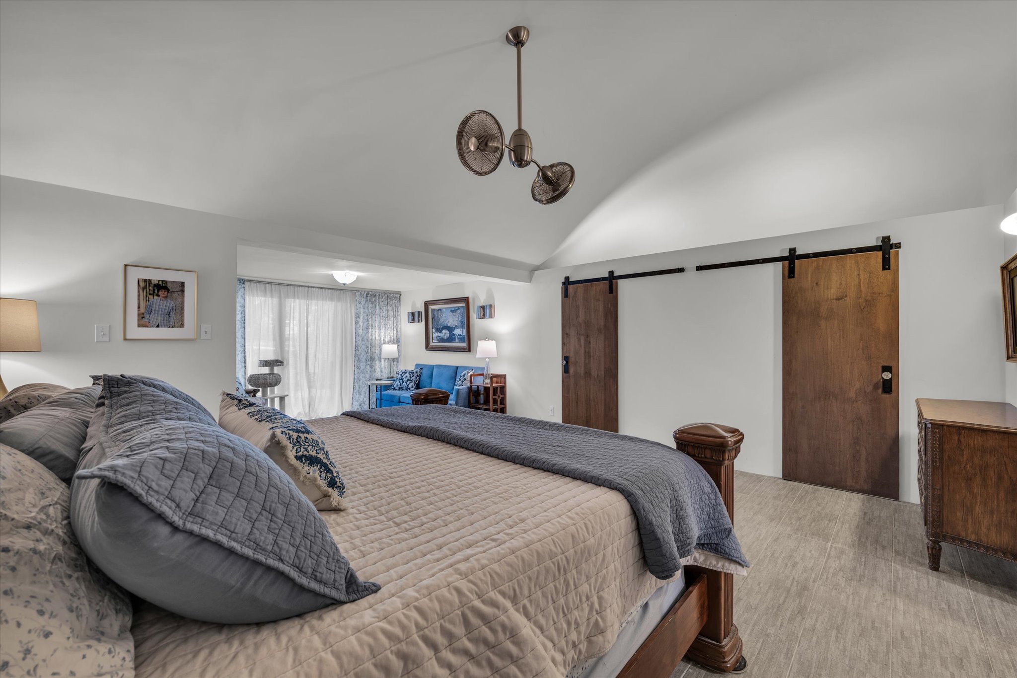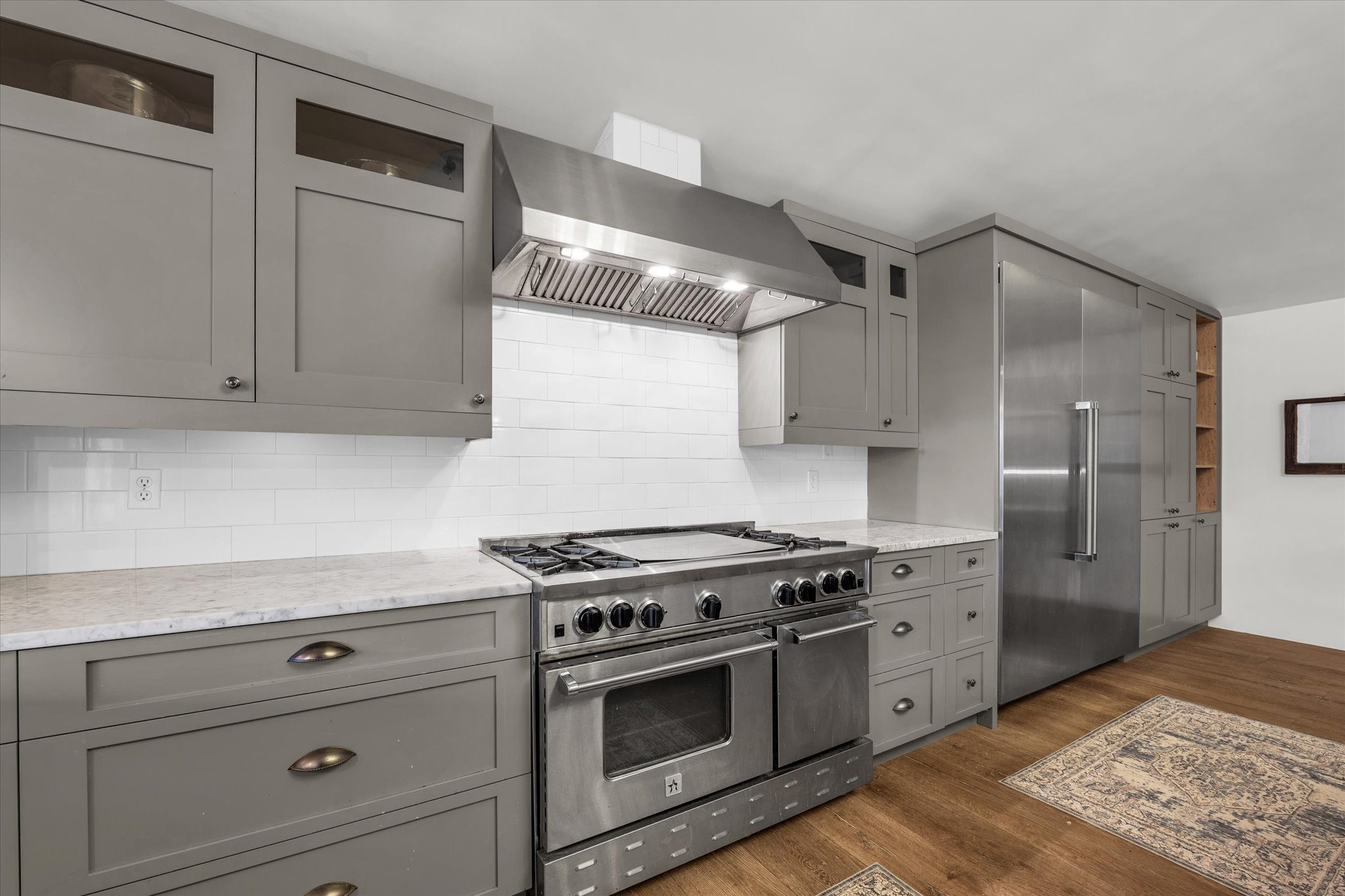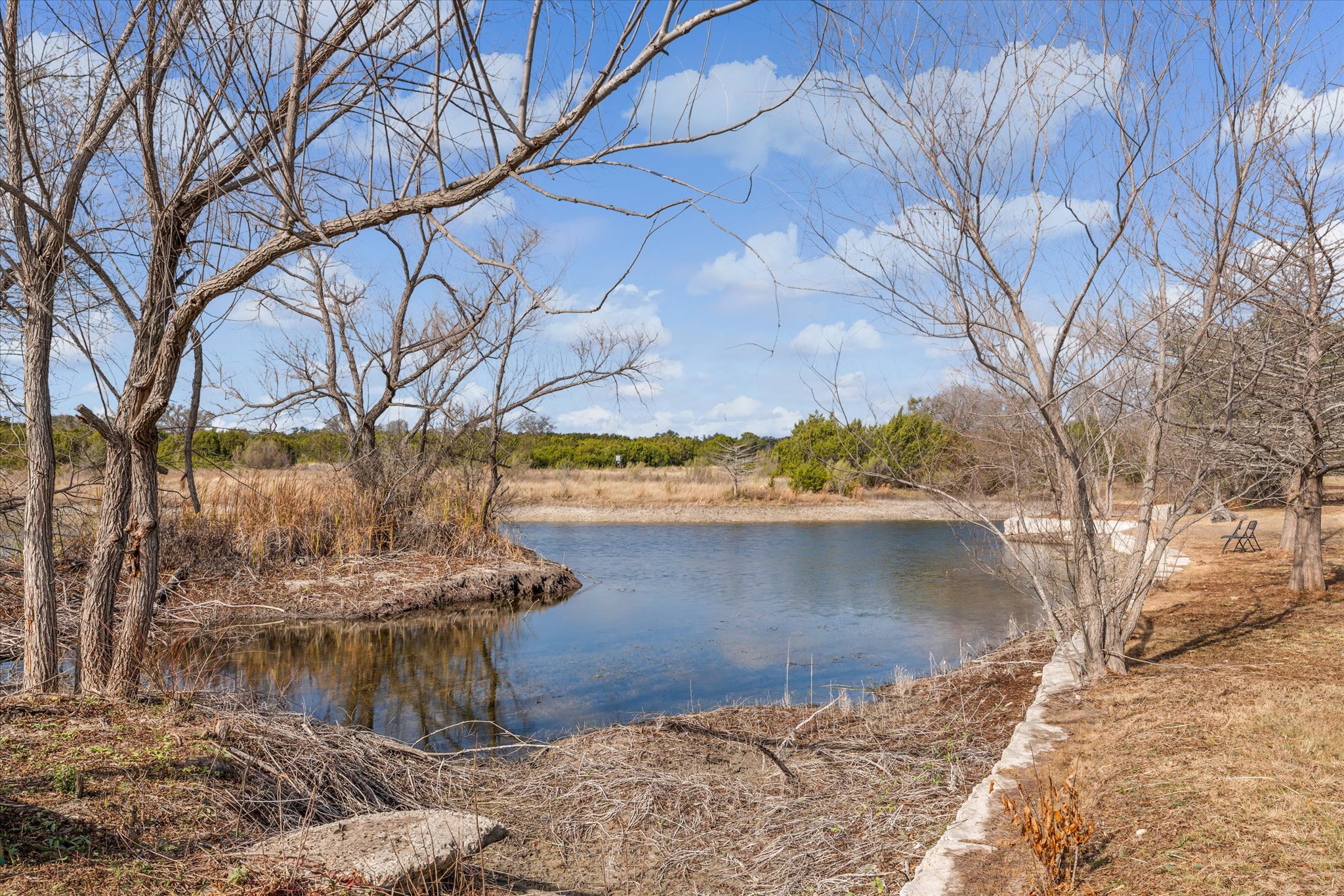 dvanced air filtration and whole-home water purification systems further enhance comfort and wellness. The kitchen serves as the heart of the home, designed for serious cooking and highlighted by a BlueStar gas range, premium appliances, and generous prep space. A thoughtful flow and natural light strengthen the connection between indoor and outdoor living. Outside, rolling Hill Country terrain unfolds with scenic views and a peaceful spring-fed pond that attracts wildlife and creates a serene backdrop.
