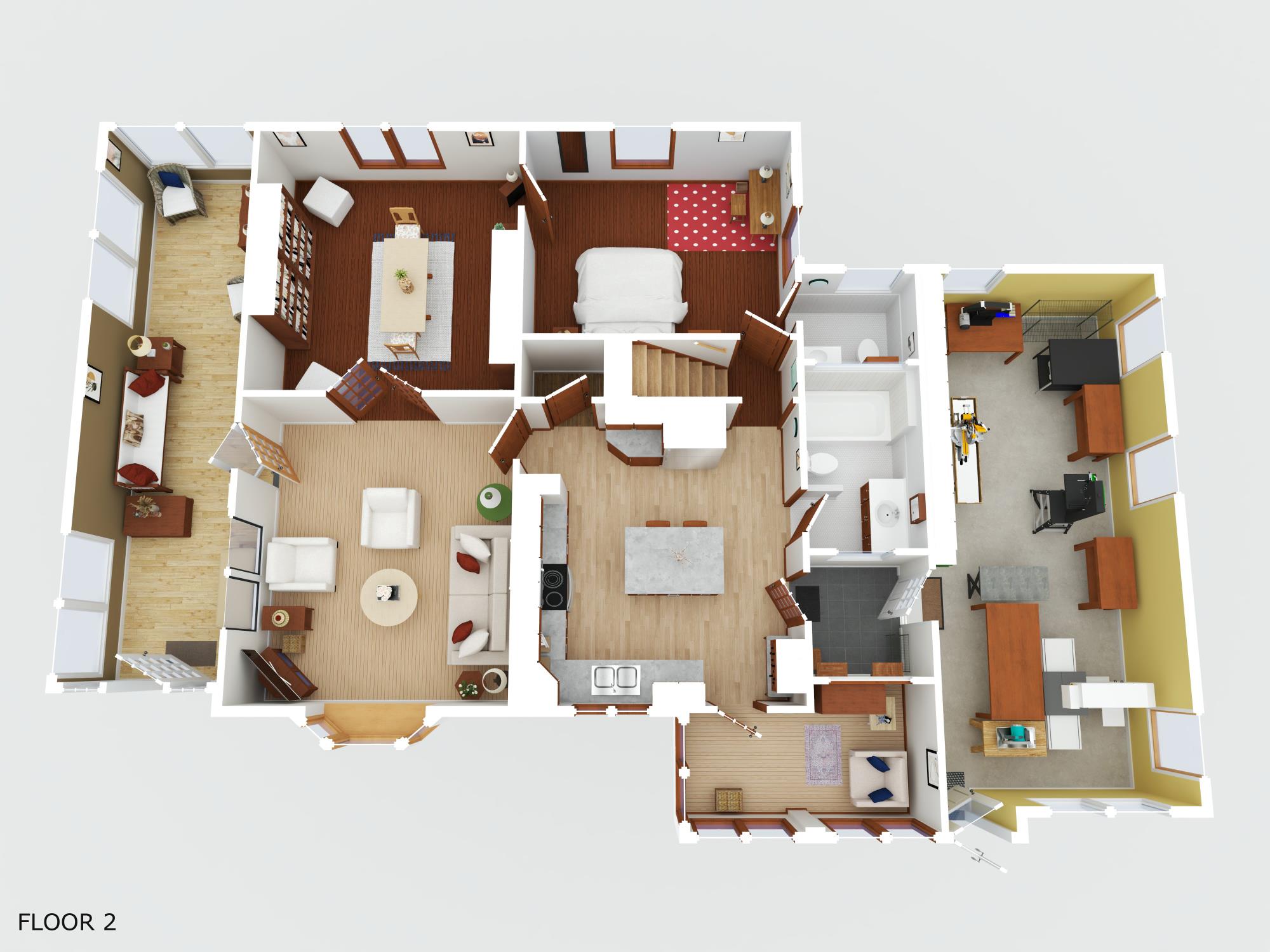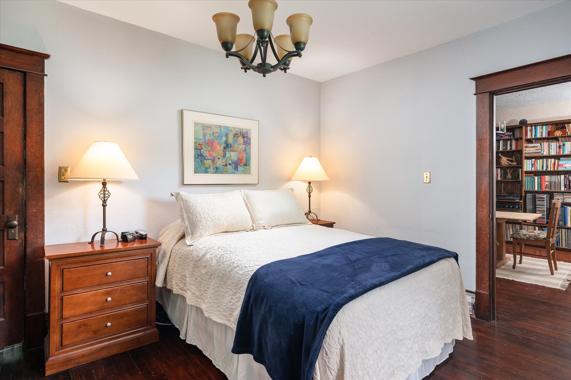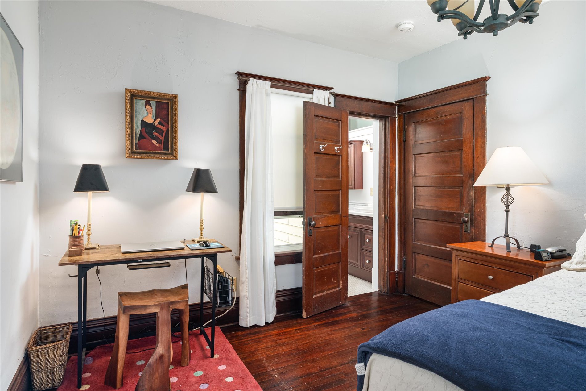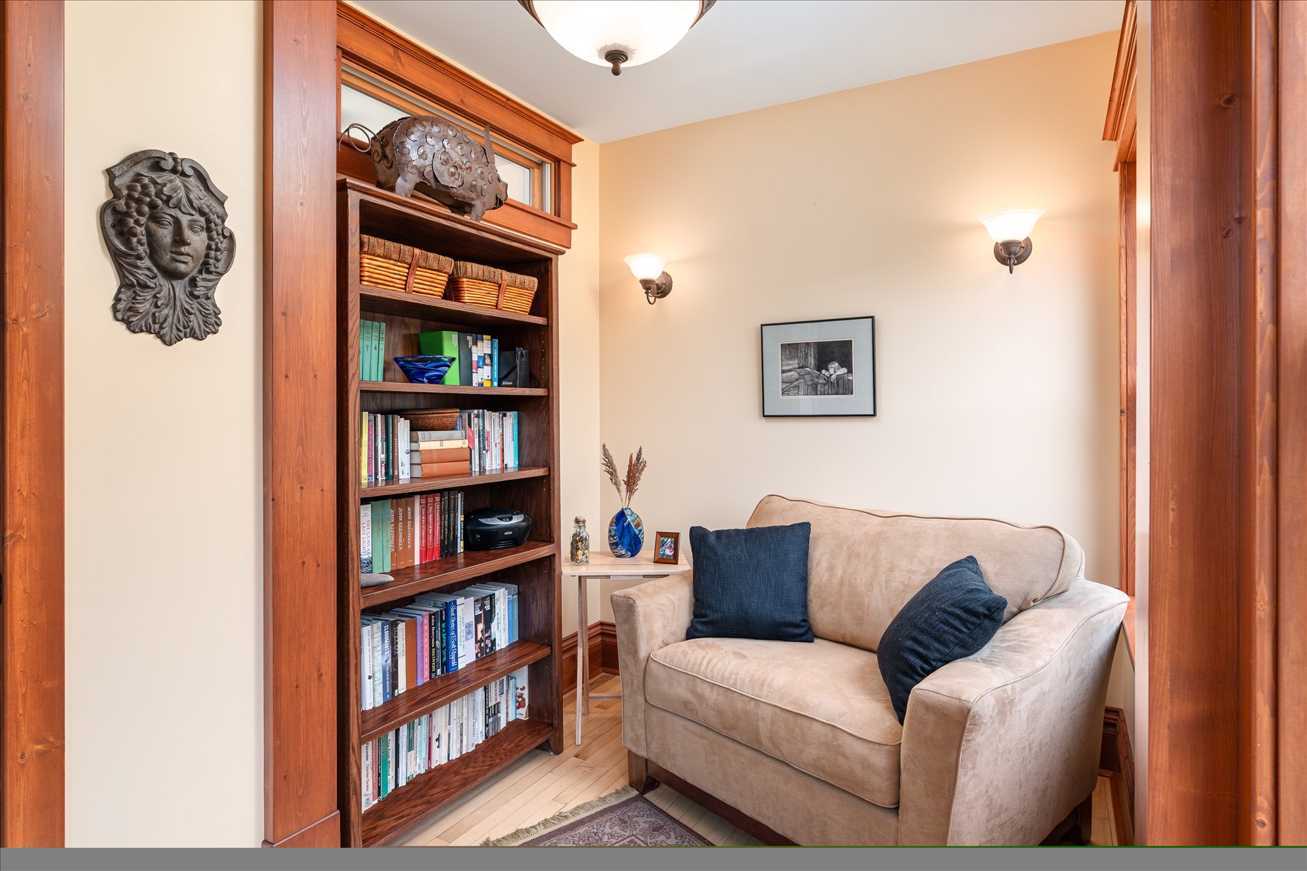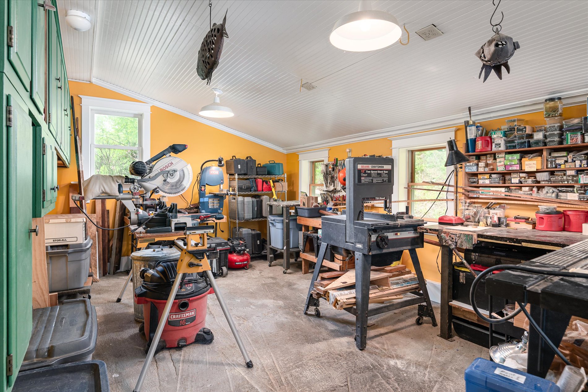 The home offers 4–5 bedrooms and 2 bathrooms, including a main-floor primary suite with private half-bath. One upper-level bedroom is plumbed for an additional bathroom. A unique studio/workshop, once a garage, serves as a haven for creatives or hobbyists.