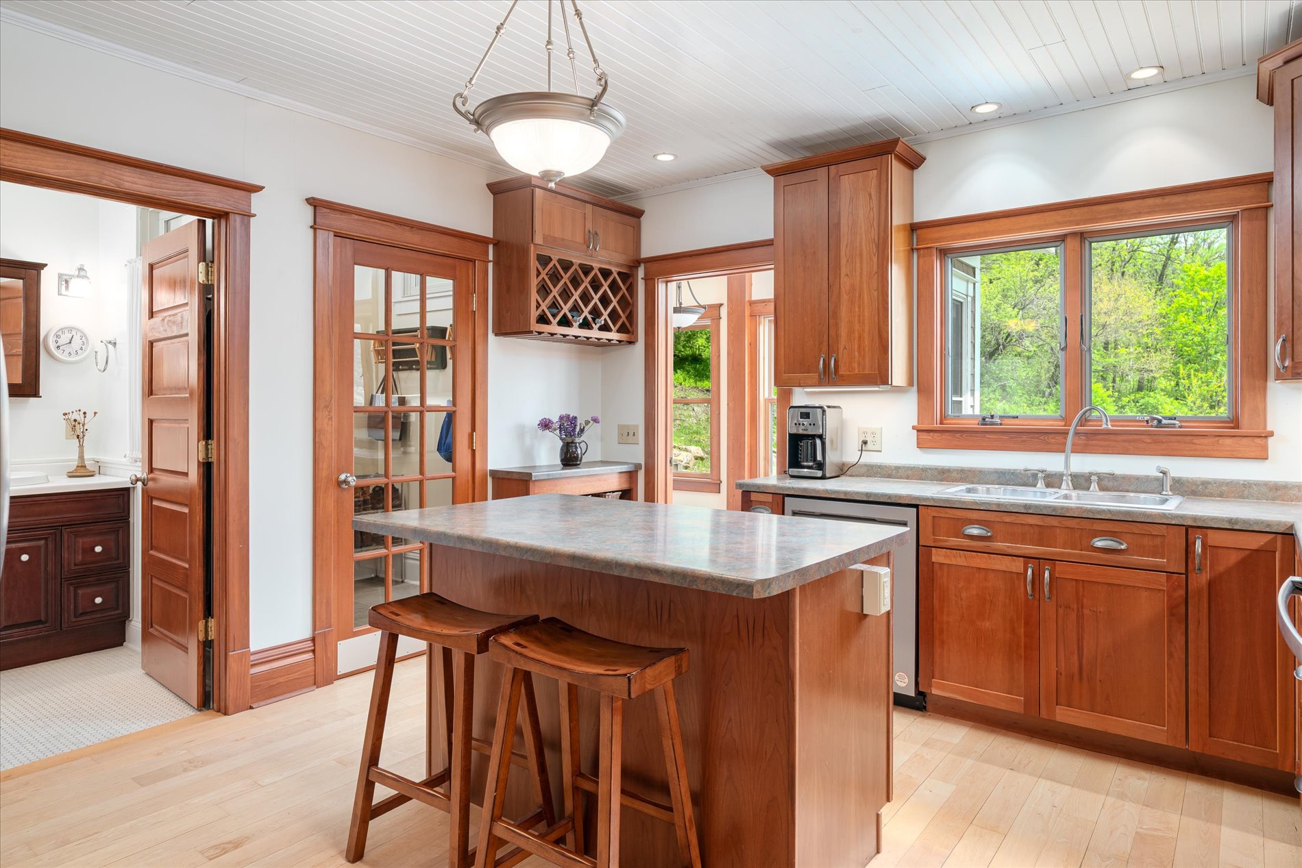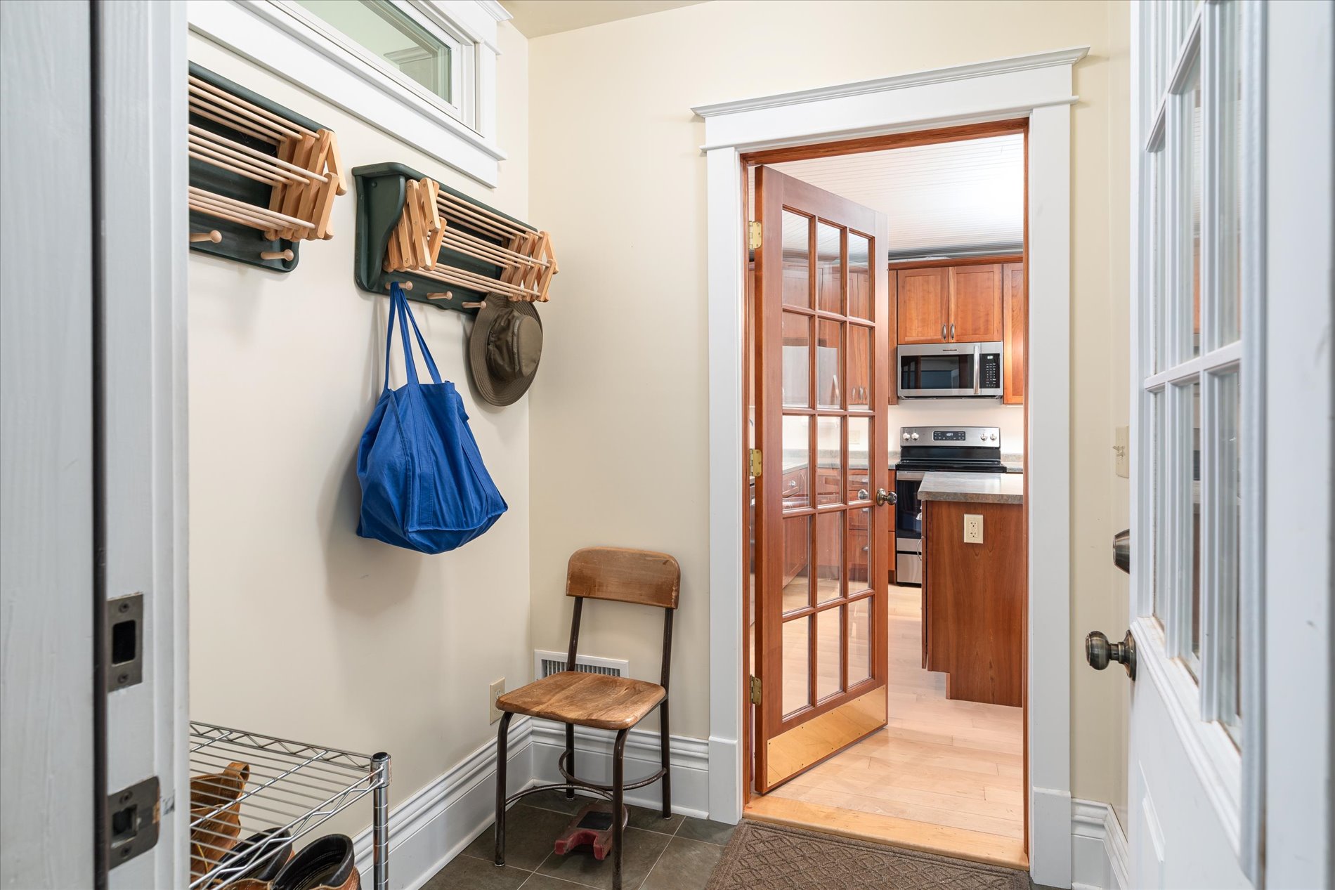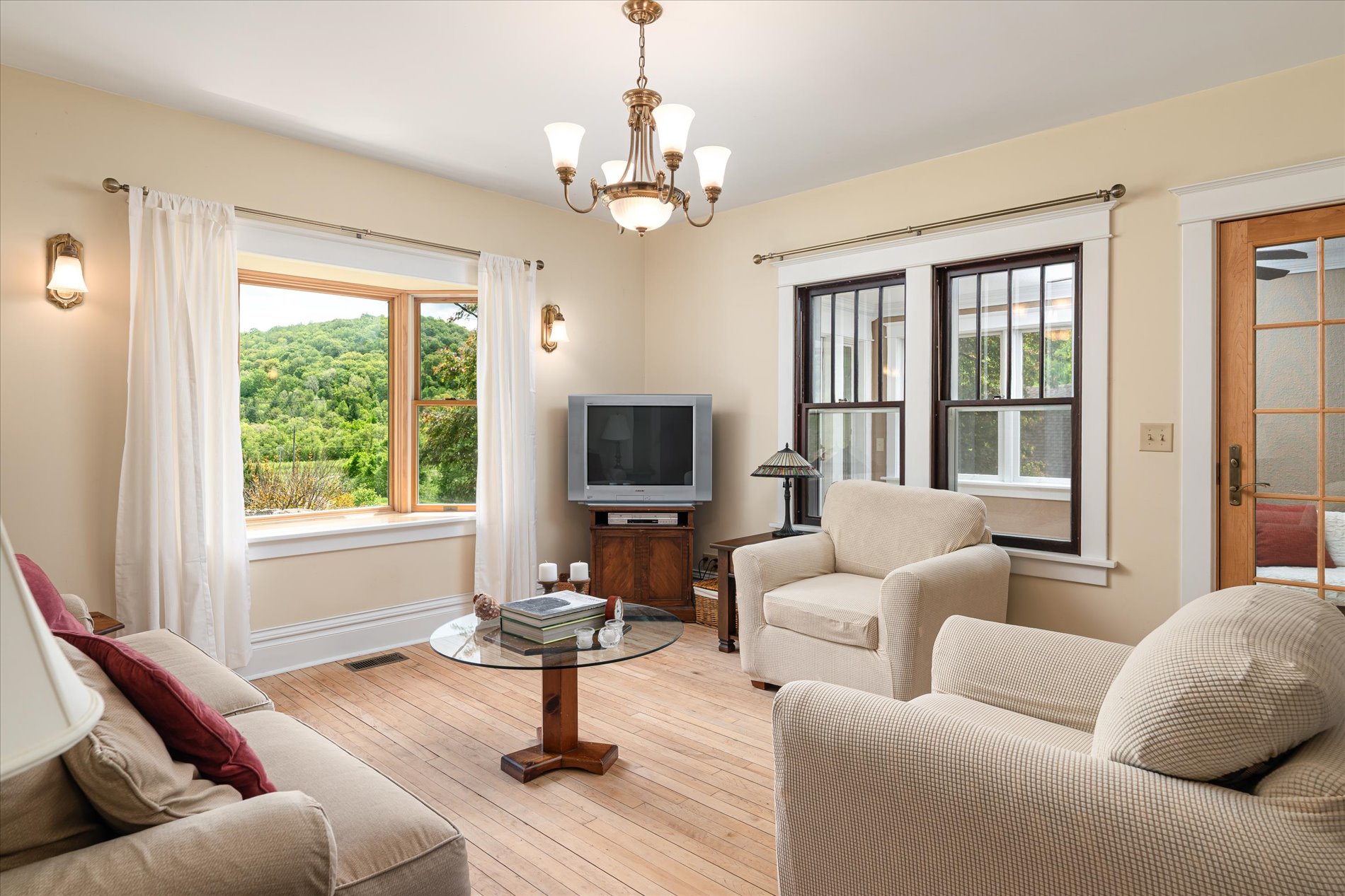 At the heart of the property stands a classic 1921 American Foursquare house. The home balances historic charm with modern updates. Spacious rooms, high ceilings, and original wood flooring reflect its heritage, while thoughtful updates in parts of the home—Anderson 400-series windows, insulation, sheetrock, reclaimed and custom millwork add comfort and efficiency. The main level features a remodeled kitchen with solid maple flooring, Thomasville cabinets, and an island. The newer stainless appliances were added in 2023. A cozy study captures morning light, and a four-season porch provides panoramic views of the valley and wooded hillsides.