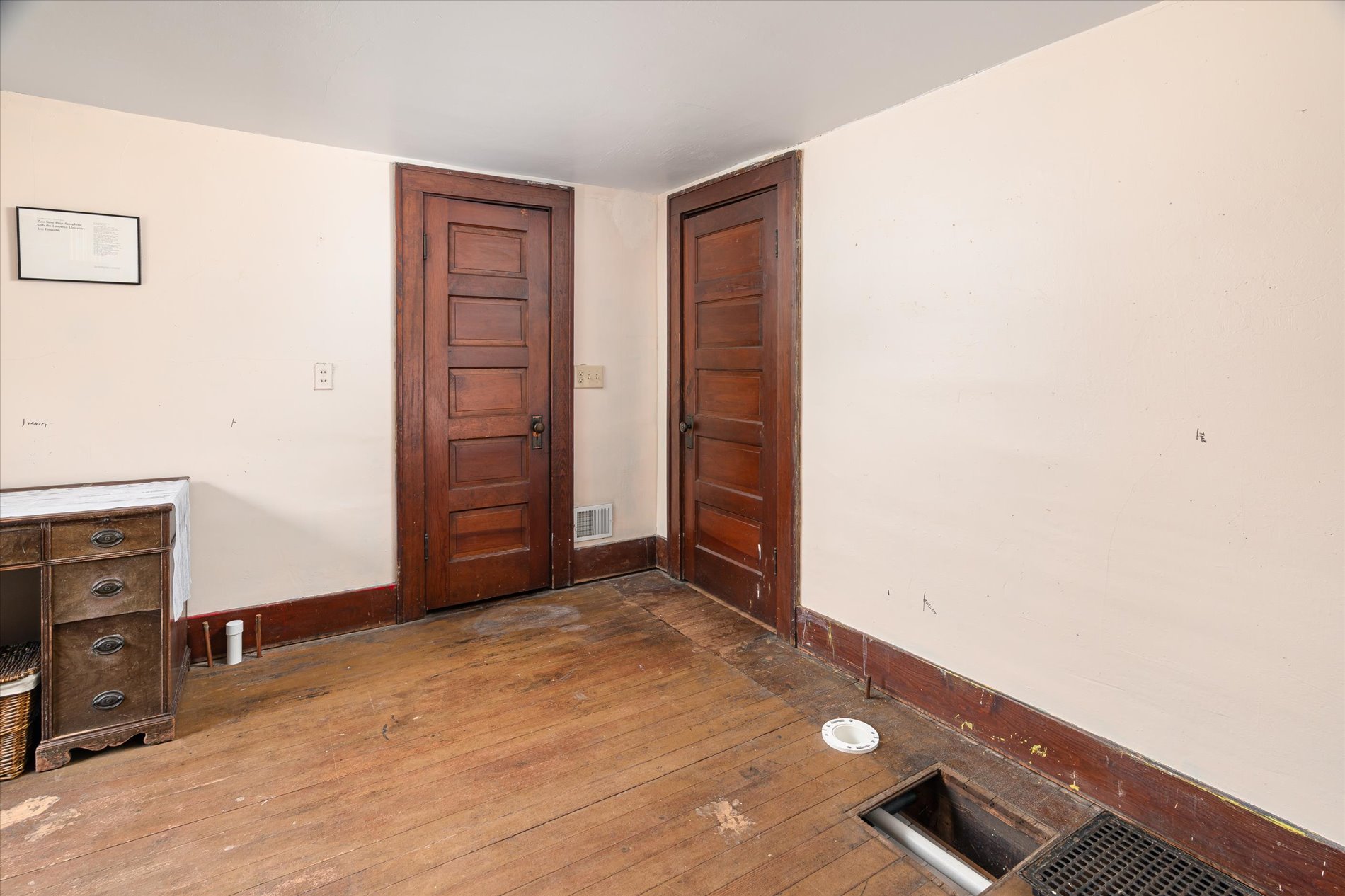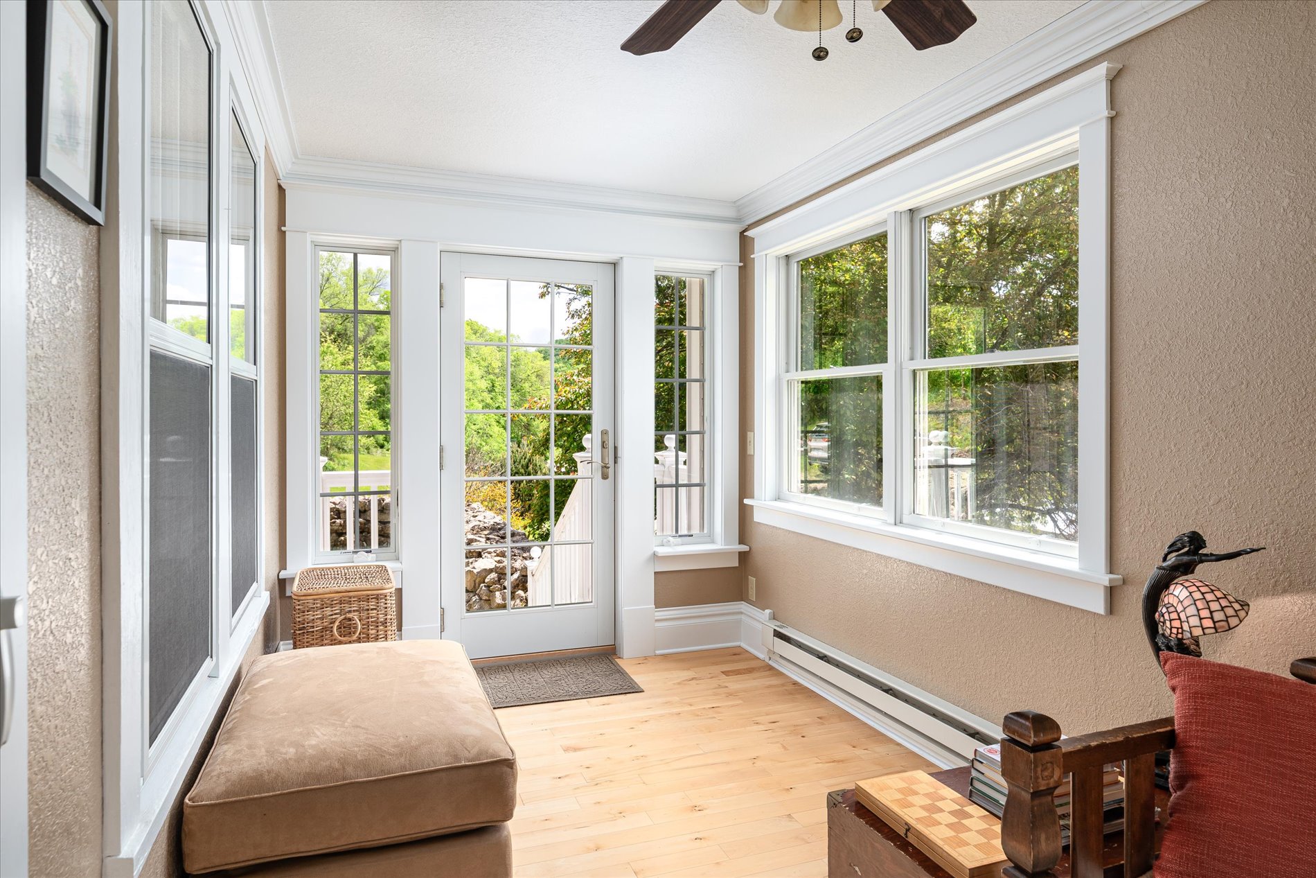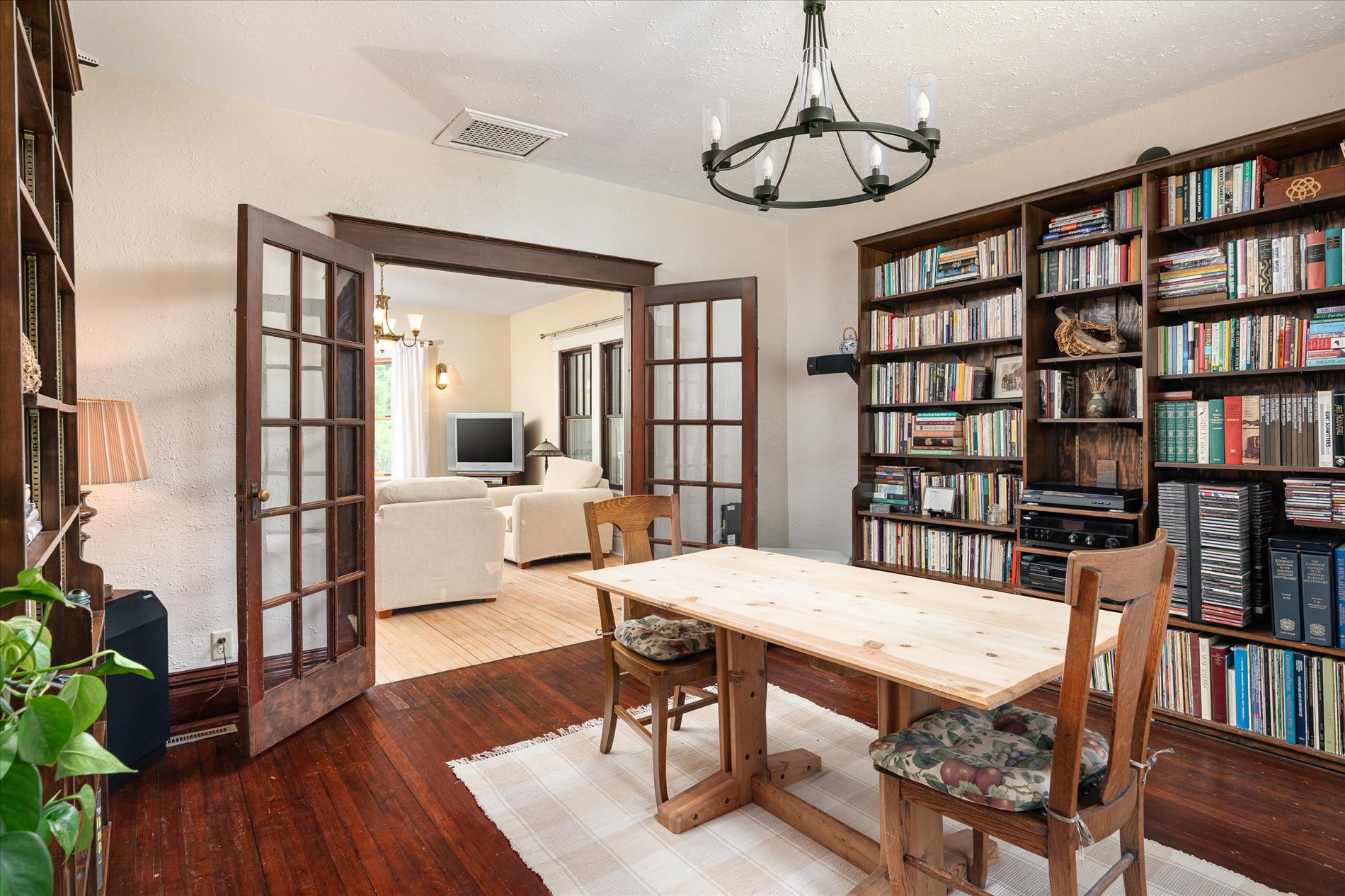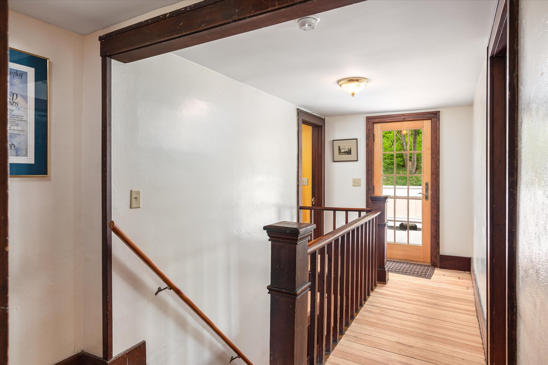 At the heart of the property stands a classic 1921 American Foursquare house. The home balances historic charm with modern updates. Spacious rooms, high ceilings, and original wood flooring reflect its heritage, while thoughtful updates in parts of the home—Anderson 400-series windows, insulation, sheetrock, reclaimed and custom millwork add comfort and efficiency. The main level features a remodeled kitchen with solid maple flooring, Thomasville cabinets, and an island. The newer stainless appliances were added in 2023. A cozy study captures morning light, and a four-season porch provides panoramic views of the valley and wooded hillsides.