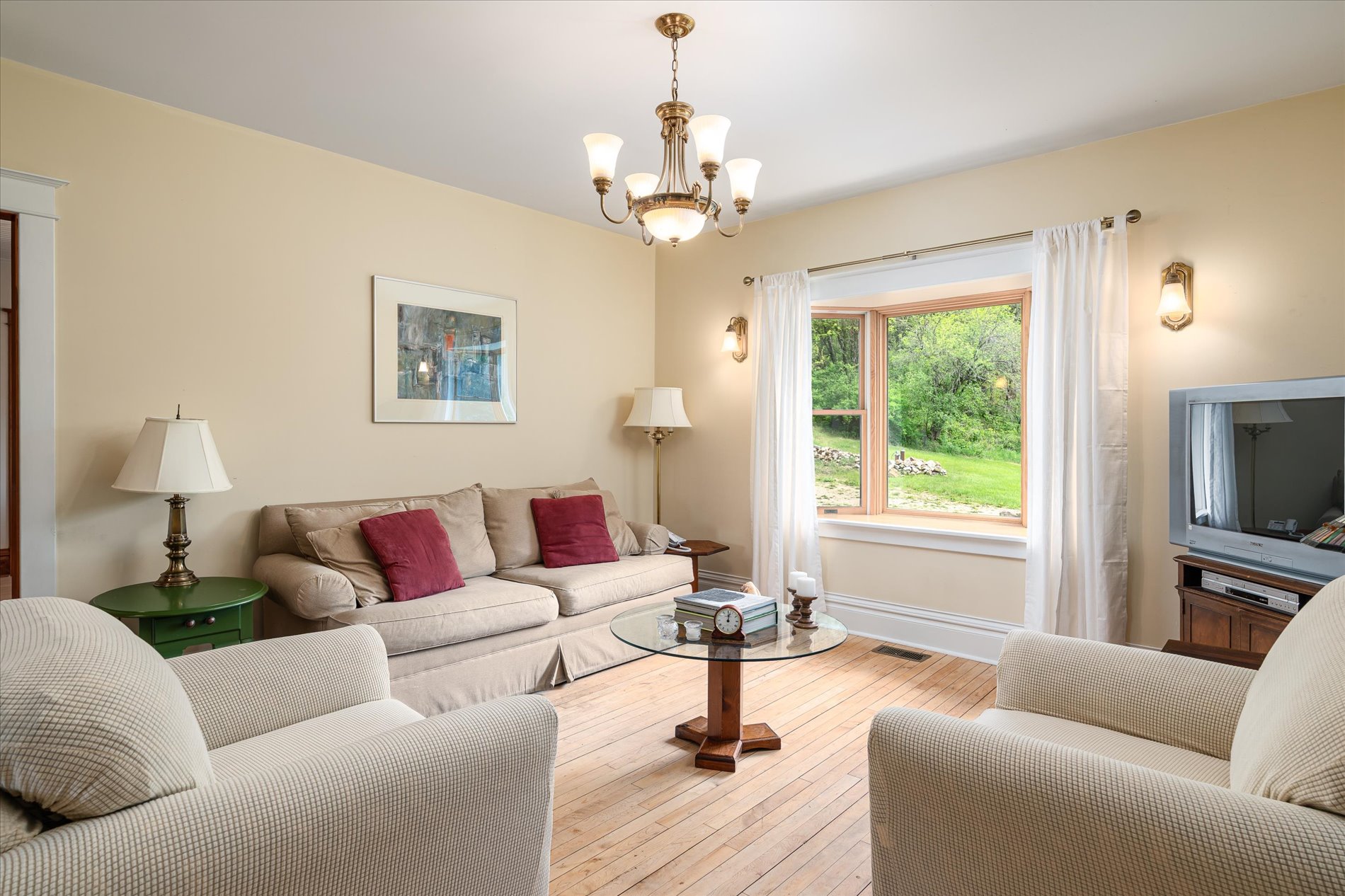 The property includes multiple outbuildings with updated electrical: a 21-stanchion dairy barn with a water hydrant and haymow, a machine shed with 60-amp service, a second shed with updated electrical service that’s outfitted for storage and garden tools, and a charming stone-walled cottage once used as temporary lodging during the home’s original construction. The cottage features updated electrical, skylights, a rebuilt loft, and could be enhanced further with added windows for expanded views.